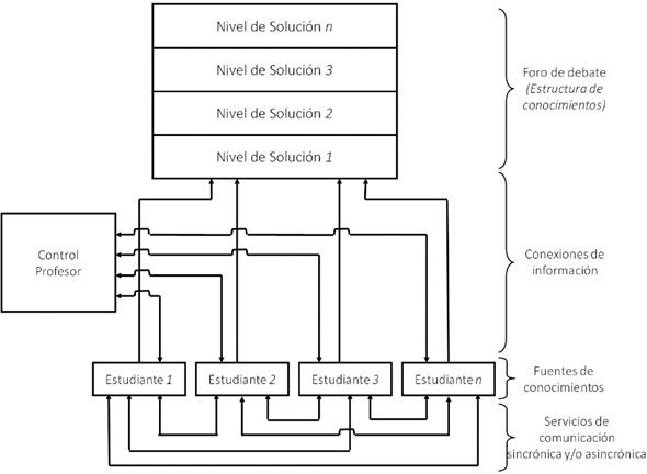 En la arquitectura se puede observar las interacciones en la comunicación que cada uno de los estudiantes puede realizar. Lo anterior. lo puede hacer de manera directa, o través del foro de debate que se presenta como una estructura de conocimientos. El profesor puede interactuar con cada uno de los estudiantes por medio de la comunicación sincrónica y/o asincrónica, animando a mejorar las respuestas dada en el foro de debate. En la Figura 3 se aprecia el papel que juega el asistente de docencia, el cual recomienda continuamente material formativo para mejorar la búsqueda de las soluciones y también aclara dudas.