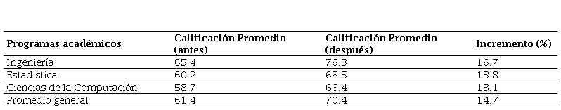 Los resultados cuantitativos indican que la implementación de la metodología didáctica propuesta tuvo un impacto positivo en el rendimiento académico y la participación activa de los estudiantes en la asignatura. Las pruebas t realizadas muestran una mejora significativa en las calificaciones promedio de los estudiantes antes y después de la implementación, con un incremento del 14.7 % en las notas finales. El grupo de Ingeniería mostró la mayor mejora, con un aumento del 16.7 % en las calificaciones. Este hallazgo sugiere que la metodología contribuyó de manera efectiva a la comprensión y aplicación de los conceptos de programación (ver Tabla 2).