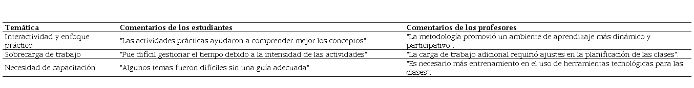 No obstante, también surgieron algunos desafíos. Algunos estudiantes mencionaron la sobrecarga de trabajo y dificultad para gestionar el tiempo debido a la intensidad de las actividades prácticas. Además, los profesores señalaron la necesidad de capacitación adicional para adaptarse a la nueva metodología y manejar eficazmente las herramientas tecnológicas utilizadas en las clases.