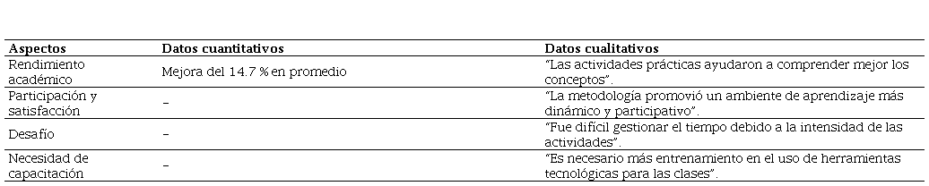 La triangulación de los datos cuantitativos y cualitativos proporciona una visión integral del impacto de la metodología didáctica. Los datos cuantitativos confirman mejoras significativas en el rendimiento académico, mientras que los datos cualitativos explican cómo y por qué estos cambios ocurrieron desde la perspectiva de los estudiantes y profesores (ver Tabla 4).