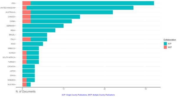 En la Figura 2 se puede evidenciar la preponderancia de países angloparlantes (Estados Unidos, Reino Unido, Australia y Canadá) en la producción científica en el área de estudio. Brasil se asoma, liderando la producción académica en América Latina. En Asia, China, India e Irán muestran una clara hegemonía. Estados Unidos, Reino Unido, Australia, Canadá y China son los que más construyen relaciones de colaboración en la producción científica. Se destaca, en este particular, el caso de Italia que, si bien ostenta un nivel bajo de colaboración con respecto a los primeros países, muestra una importante producción bibliográfica en colaboración con autores de otras latitudes (MCP por sus siglas en inglés: Multiple Countries Publication). Varios países como Alemania, India, Brasil, Grecia, entre otros, aparecen con publicaciones desarrolladas por autores locales (SCP por sus siglas en inglés: Single Country Publication).
