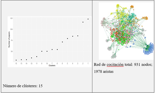 En la clusterización de la red de citación, se identificaron 16 comunidades que representan 931 Nodos o publicaciones, que se enlazan en una red de 1978 aristas o citaciones. Superior a 80 documentos se identificaron cuatro clústeres que se constituyen en la base del análisis narrativo y de tendencias de investigación (ver Figura 4). Los cuatro clústeres identificados representan 659 nodos o artículos, conectados por 1560 aristas o citaciones. Posteriormente, se presenta en la Figura 5 la red de citas de los cuatro principales clústeres. Asimismo, la correspondiente nube de palabras clave de cada uno de los clústeres que ofrecen una noción preliminar de las tendencias de investigación en la materia.