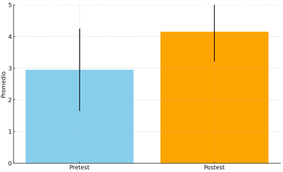 Los resultados de la prueba de Shapiro-Wilk[1] y Kolmogorov-Smirnov[2] indicaron que los datos no siguen una distribución normal. Por tanto, se aplicó la prueba de rangos con signo de Wilcoxon para evaluar la significancia estadística de las diferencias observadas entre pretest y postest. Esta prueba arrojó un valor de p < 0.001, confirmando que las mejoras observadas no son producto del azar, validando así la hipótesis de investigación H1.