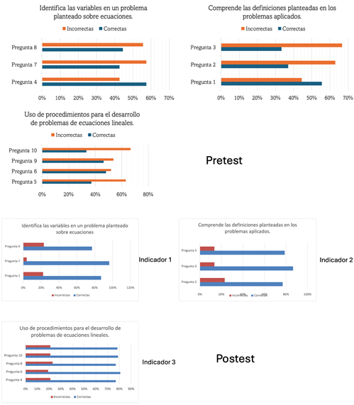 En la Figura 3 se muestran los resultados alcanzados por indicadores en el pretest y postest, donde se detalla la distribución específica de las respuestas correctas por cada uno de los indicadores analizados, destacando el progreso logrado tras la intervención.