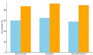Postest: se observó un aumento en el porcentaje de respuestas correctas, alcanzando un 87 %, lo que evidencia un fortalecimiento conceptual.