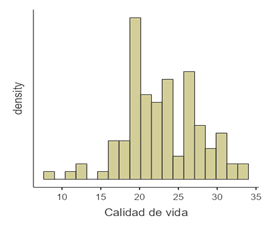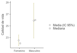 Se realizó la prueba de Shapiro Wilk para identificar la distribución de la variable calidad de vida, obteniendo un valor p de 0,14, por lo que se asumió que la variable provenía de una distribución normal. Posteriormente, se compararon las puntuaciones promedio de calidad de vida entre los hombres y las mujeres por medio de la prueba t de student, encontrando un valor p de 0,03, por lo que se asumió que existían diferencias estadísticamente significativas en los promedios de la calidad de vida entre hombres y mujeres, reportando menores puntajes las mujeres (ver Figura 3).