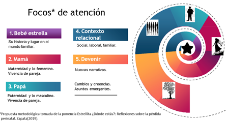 Zapata-Posada (2019), en la conferencia titulada: ¿Estrellita dónde estás?: Reflexiones sobre la pérdida perinatal, propone la figura de la Caracola para darle sentido a la propuesta denominada “Trayectorias y cicatrices”, con la cual se busca representar el tránsito no lineal de las familias por la experiencia de duelo. La presente investigación conservó el nombre de Caracola, asignado porla autora, como metáfora del espiral que permite un camino dinámico y con posibilidades infinitas; para efectos de este estudio se planteó una reducción en la duración del proceso, dado que, si bien originalmente Zapata-Posada (2019) propone 11 focos de conversación con las familias, o sea 11 sesiones, a partir de la contextualización de esta experiencia se retomaron cinco de ellos: 1) Bebé estrella, 2) Mamá, 3) Papá, 4) Contexto relacional y 5) Devenir. Los cinco focos de conversación orientaron cinco encuentros realizados a través de telemedicina, con una periodicidad semanal, y cada uno tuvo una temporalidad entre una hora y una hora y treinta minutos; se acompañaron desde un estilo de trabajo terapéutico de terapeuta, coterapeuta y supervisora.