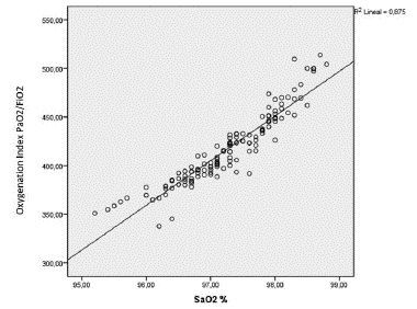 Finally, the oxygenation index was calculated (PaO2/FIO2) obtaining average values of 416.83 (95% CI 410.63-423.03), ranging between 337.62 and 513.81; no gender or age differences were identified (P = 0.69). The scatter plot illustrating the relationship between (PaO2/ FIO2) and SaO2% indicated that the 76.6% variability (variance) was the same for both variables, with an R2 of 0.875 (Fig. 1).