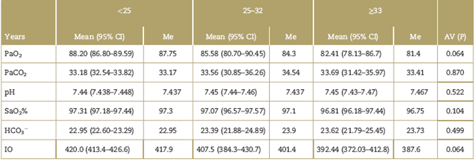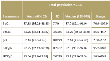 A total of 137 participants were enrolled. A sample was taken from each participant to analyze the parameters of the study; the mean age was 22.5 years (95% CI 21.7-23.3) and the age range as from 18 to 40 years old. Table 1 shows the results for PaO2, PaCO2, HCO3~, pH, and SaO2%.