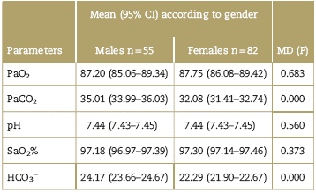 A total of 40.1% (n = 55) of the samples were taken from males and 59.9% (n = 82) from females. The HCO3- and PaCO2 values were significantly higher in males than in females, with a 1.88 (95% CI 1.26-2.50) and 2.94mm Hg (95% CI 1.78-4.09) difference, respectively (Table 2).
