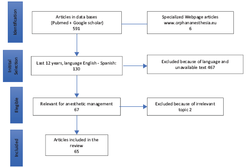 PubMed, Google academic, and the web page of orphan-anesthesia databases were consulted, using the MeSH terms for each disease and the term MeSH: anesthesia (Table 1). The publications of the last 12 years in English or Spanish available as full text and relevant for anesthetic management were selected. The articles were chosen based on the principal authors (P.E.M. and A.M.B.), in accordance with the purpose of the review. The final selection and classification of the articles is described in Table 2 and Fig. 1. Due to the type of articles identified- mostly reports and case series-the decision was made not to make Grading of Recommendations Assessment, Development and Evaluation (GRADE) analyses to classify the evidence.