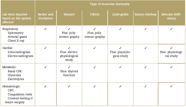 Table 4 describes the pre-surgical laboratory examinations and complementary tests that should be ordered to patients with muscular dystrophy undergoing surgery. The most frequent recommended tests are creatinkinase levels, Complete Blood Count (CBC) coagulation tests, echocardiogram, EKG, and lung function tests.