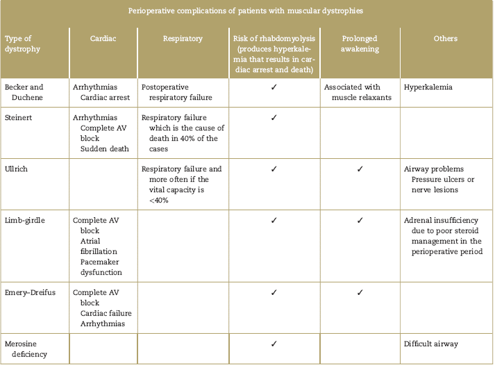 The anesthetic management of patients with muscular dystrophies is particularly difficult because of the risk of rhabdomyolysis leading to hyperpotassemia and cardiac arrest, malignant arrhythmias, increased muscle weakness, airway management problems, and exacerbation of the respiratory failure. It is important to stress that the anesthetic risk depends on the type of surgery, the clinical condition of the individual patient, and the progression of the disease; the following recommendations are general but sound clinical judgment should prevail for each particular patient.