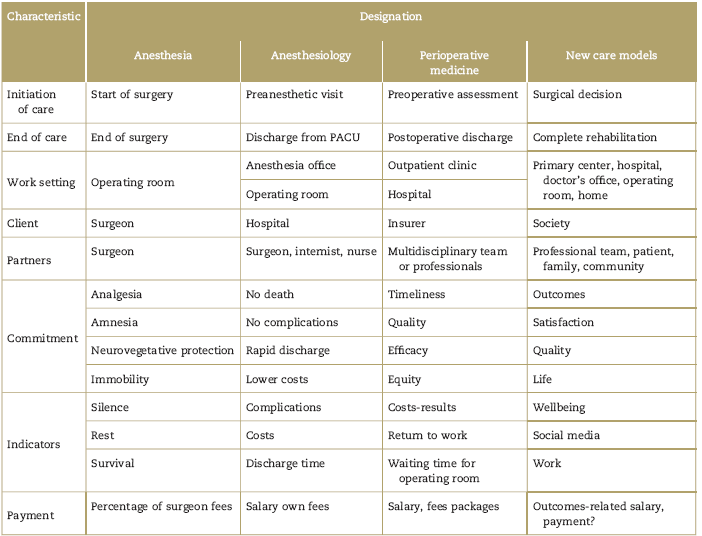 Structural changes must be introduced in the care model currently used with patients requiring surgical treat ments.1-5 Proposed changes include eliminating silos, and focusing on meeting the needs of the patient, the caregivers and the community. The first of these changes requires going back to integrated health systems and adding primary and home care settings to the daily practice of the anesthetists.6-11 The second change requires an expansion of the horizon for assessing the outcomes of perioperative care to consider long-term results.12-15 Moreover, it means gaining new competencies, in particu lar non-technical skills16,17 (assertive communication, teamwork, professional and institutional leadership, and awareness of social conditions), and systematizing the non-declarative knowledge gained so far after a century of practicing the "art of anesthesiology".18
