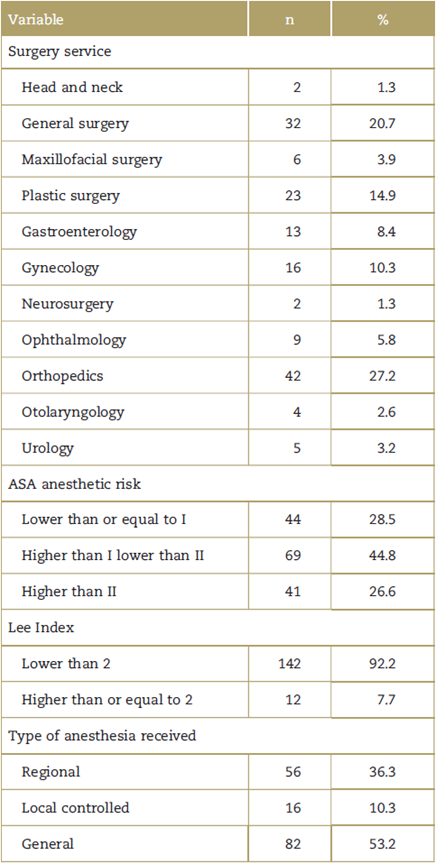In terms of clinical variables, 44.8% of the respondents were found to have an ASA II pre-anesthetic risk. A Lee index lower than 2 was identified in 92.2% of the cases.
