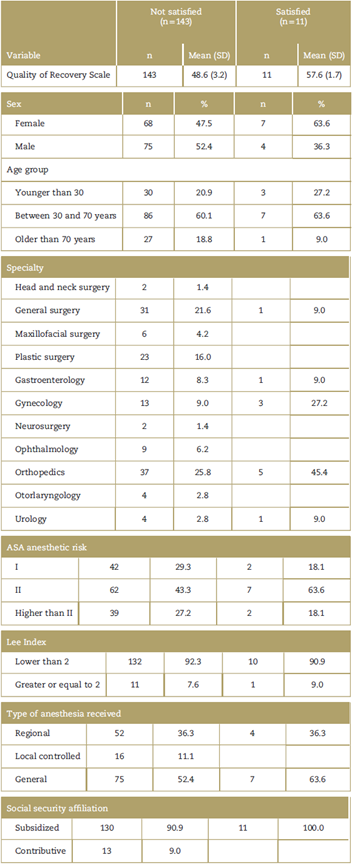 The QRS allows to include patient perspective as part of the quality indicator in recovery. When it was applied to the group of patients at HUS, it was found that 7.14% of the total sample was satisfied with the quality of recovery, as compared with the results published previously for this scale in Medellin (80.4%)." The difference in the values of the 2 publications may also be attributed to the types of procedures performed in the high-complexity hospital, and to the timing of the assessment (3 vs 24 hours).