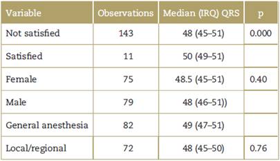 In terms of differences related to the most relevant characteristics, the Wilcoxon test results for the QRS show a statistically significant difference only between satisfied and not satisfied patients (P < 0.05). There are no statistical differences for patient gender or the type of anesthesia, which signals that the QRS has no effect for those characteristics. The results of the t test for the most relevant characteristics are shown in Table 3.