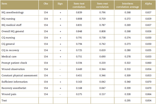 Finally, Cronbach's Alpha test used to determine consistency of the QRS showed high internal consistency (Cronbach's Alpha = 0.854), with an average interitem correlation (Rho = 0.295) (Table 4). This confirms the reliability of the scale and allows to assume that there is a high correlation among items for measuring the postanesthetic recovery quality construct in a high-complexity setting.