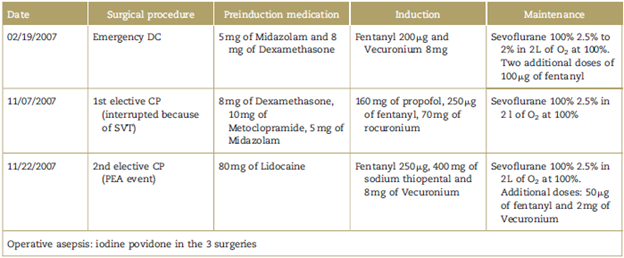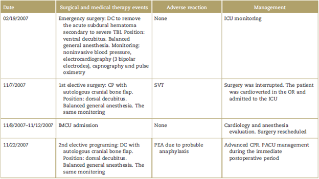 A 44-year-old male patient from a rural area, admitted to the intermediate care unit following his discharge from the intensive care unit (ICU), as a result of supraventricular tachycardia (SVT) over an elective cranial surgery which led to the interruption of the procedure (Table 1). A mild right hemiparesis was identified in the patient on clinical examination. The cardiology evaluation failed to identify any alteration and concluded that the SVT was the result of surgical manipulation or autonomic reflex. An amount of 10 mg of propanolol b.i.d. were prescribed, with a Goldman 2 index classification. No allergies (neither food nor drugs) were reported during the anesthetic evaluation and the patient was classified as American Society of Anesthesiologists (ASA) class 2 and was rescheduled.