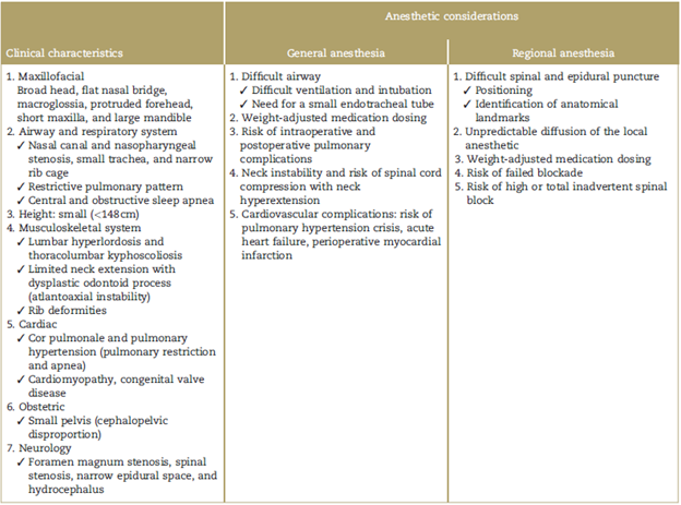 Some of the relevant anatomic characteristics include the maxillofacial and airway morphology, with patients usually presenting with broad head, prominent forehead, short maxilla, large mandible, macroglossia, limited neck extension, and pharyngeal, laryngeal, and/or tracheal stenosis,4,7 which in combination may lead to difficult airway management during general anesthesia.