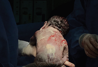 The patient was readmitted at 37 weeks of gestation for elective cesarean section using spinal-epidural technique, with no intraoperative or postoperative complications, and was delivered of a newborn adequate for gestational age, weighing 2879 g, with 1 and 5 minute Apgar scores of 8 and 9, respectively. Figure 3 shows the neonate with completely healed spine. Assessment of the newborn by the pediatric neurologist at 24hours found no hydroceph-alus or Arnold Chiari II malformation, and discreet lower limb motion.