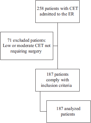 During the period between April 2011 and April 2014, 258 patients were treated for CET in the emergency department of the HUSVF. Of these, 187 patients met the inclusion criteria (Fig. 1).