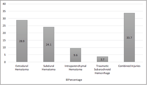 The main neurological lesion found was a combination of extradural hematoma (EH) and subdural hematoma (SH) (33.7%), followed by EH (28,9%) and SH (24.1%) (Fig. 2).