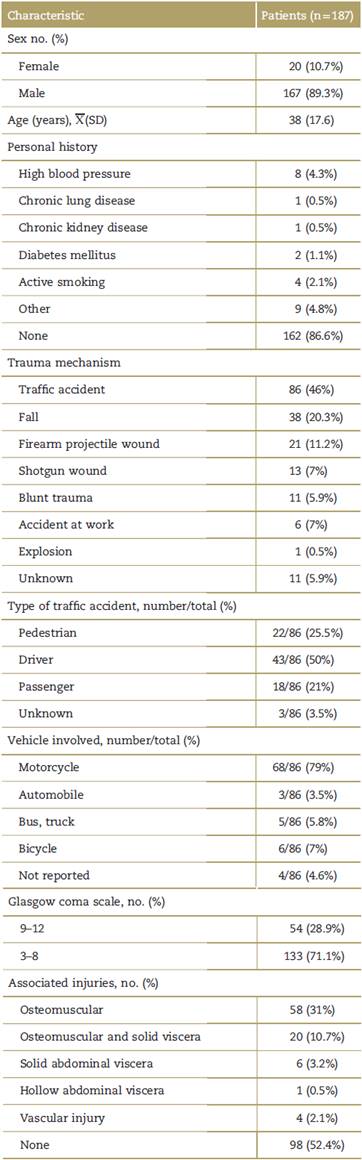 In terms of clinical outcomes, no patient died during the surgical procedure; however, 30 of the 187 patients died during hospital stay, secondary to complications associated with the severity of the injury, that is a mortality of 16% (CI 95%: 10.7-21.3) (Table 3).