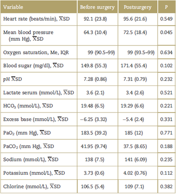 From the metabolic point of view, arterial gasometry and perioperative glycemia and lactate measurement were performed only in 47% of the patients. The main metabolic profile of the patients was hyperlactatemia metabolic acidosis, in 95% of the cases (Table 2).