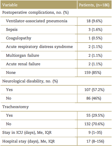 Finally, we highlight the high incidence of neurological dysfunction in this type of patient, which corresponds to 54% of all cases evaluated. These complications ranged from motor dysfunction to moderate-to-severe cognitive dysfunction, the latter being the most prevalent in our study. This finding explains 29% of patients who had to undergo definitive tracheostomies.
