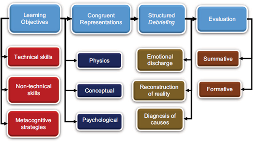 We recommend that learning objectives include disciplinary skills, non-technical skills (asking for help, leadership, role-taking, closed-loop communication, resource mobilization, situational awareness, etc.).17 and metacognitive strategies. These objectives should be shared with the students before starting the simulation exercise, when the teacher provides guidance on what will be done during the session, in order to establish an atmosphere of trust and psychological assurance.18