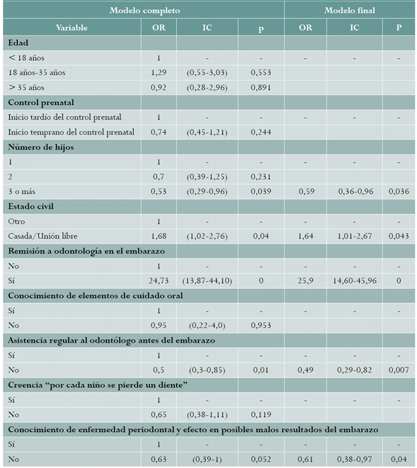 En el análisis multivariado, las variables asociadas a la asistencia a la consulta odontológica en el control prenatal en el modelo fueron: el estado civil (casada o en unión libre) (OR= 1,68; IC 95 %: 1,02-2,76); la remisión al odontólogo (OR= 25,90; IC 95 %: 14,60-45,96). Por otra parte, los factores asociados a la consulta odontológica fueron: la no asistencia regular al odontólogo antes del embarazo (OR= 0,49; IC 95 %: 0,29-0,82), el desconocimiento sobre el efecto de la enfermedad periodontal en la salud fetal (OR= 0,61; IC 95 %: 0,38-0,97), y tener 3 o más hijos (OR= 0,59; IC 95 %: 0,36-0,96) (tabla 3).