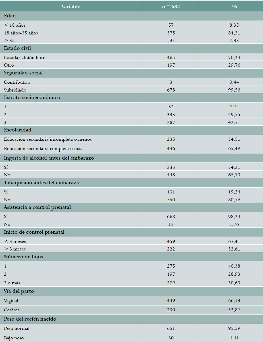 Materiales y métodos: Estudio de corte transversal descriptivo. Se incluyeron 682 mujeres que asistieron al primer control neonatal y cuyo parto fue atendido en la misma institución entre los años 2011 y 2012, en un hospital de segundo nivel de complejidad, ubicado en una localidad de ingreso socioeconómico bajo en la ciudad de Bogotá. Se midieron variables sociodemográficas, factores relacionados con comportamientos de salud oral, estilos de vida, conocimientos sobre la salud oral y el embarazo; se exploró el conocimiento sobre el efecto del embarazo en la salud oral y sobre el efecto de una pobre salud oral en el desenlace del embarazo. Se realizó un modelo de regresión logística para explorar asociaciones entre hábitos de higiene oral, hábitos de salud, conocimientos y creencias, y la asistencia a la consulta odontológica.