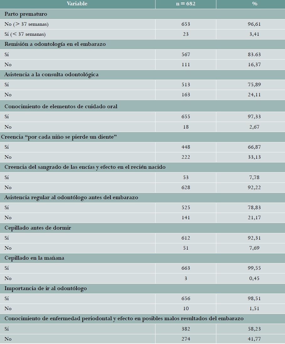 Materials and methods: Descriptive, cross-sectional study that included 682 women coming to the first neonatal follow-up visit and who were delivered in the same Level II institution located in a low-income area in Bogotá, during 2011 and 2012. The variables measured included social and demographic factors, factors associated with oral health, life-style, knowledge about oral health and pregnancy. The knowledge about the effect of pregnancy on oral health and about the effect of poor oral health on the outcome of pregnancy was explored. A logistic regression model was used to explore associations between oral hygiene habits, health habits, knowledge and beliefs, and attendance to the dental care clinic.