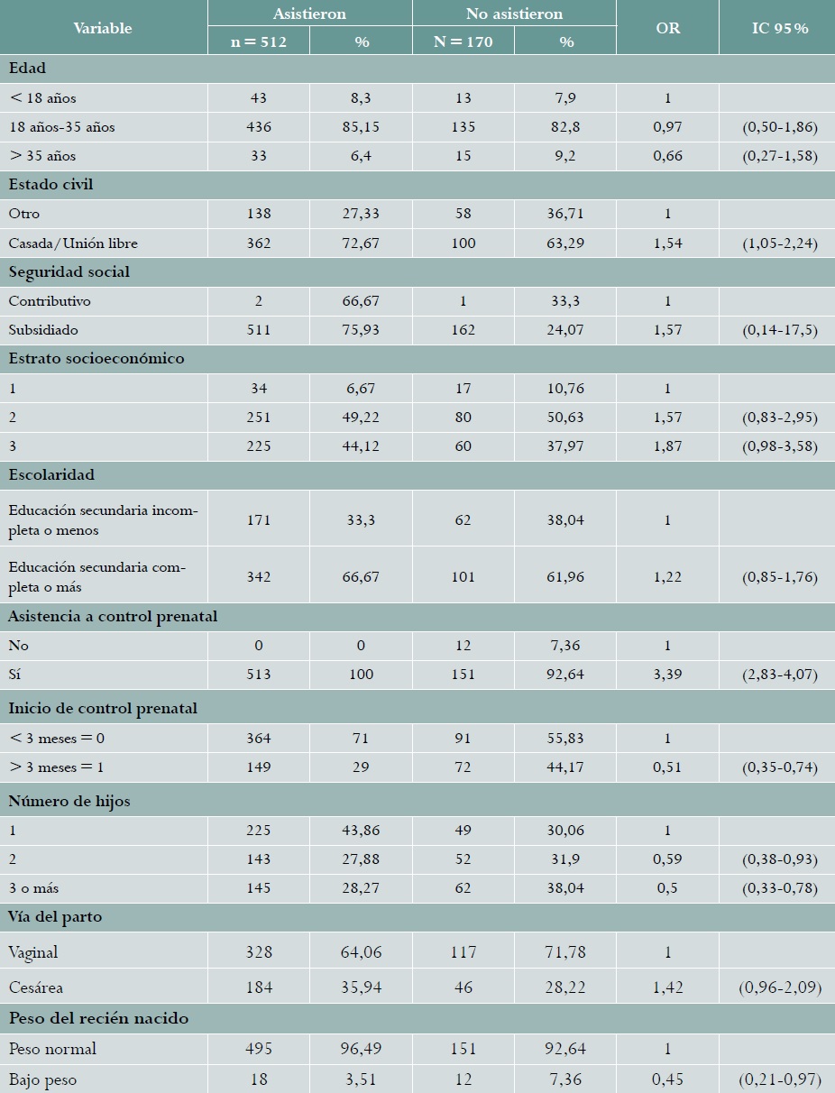 Procedimiento. El instrumento de recolección de la información fue aplicado por profesionales de la salud entrenados, previa firma del consentimiento informado, y se diligenció al terminar el control neonatal al que acudían las mujeres. El instrumento de recolección de la información para este estudio fue diseñado y validado por el grupo de investigación Unidad de Investigación Básica Oral (UIBO) de la Universidad del Bosque en Bogotá; se realizó prueba piloto de este instrumento en 20 mujeres. Variables medidas. Se evaluaron factores socio-demográficos como la edad, el nivel educativo, el estado civil, el estrato socioeconómico, el tipo de afiliación al sistema general de seguridad social en salud, así como factores relacionados con comportamientos de salud oral como la frecuencia del cepillado, elementos para el lavado de los dientes, frecuencia de visitas al odontólogo (cuando no está embarazada); estilo de vida como fumar e ingesta de alcohol. Dentro de los factores relacionados con el embarazo se evaluó la paridad, bajo peso al nacer, parto prematuro, control prenatal, inicio del control prenatal. En conocimientos sobre la salud oral y el embarazo se exploró qué tanto sabían sobre el efecto del embarazo en la salud oral y sobre el efecto de una pobre salud oral en el desenlace del embarazo. Análisis estadístico. Se realizó análisis descriptivo usando distribuciones de frecuencia y proporciones para las variables categóricas, y medidas de tendencia central y de dispersión para las variables continuas. Se realizó análisis bivariado usando regresión logística simple reportando los Odds Ratio (OR) crudos para cada una de las variables con sus respectivos intervalos del 95 % de confianza (IC 95 %). Para el análisis de asociación con la variable asistencia a la consulta odontológica, se construyó un modelo de regresión logística multivariado donde se incluyeron las variables con resultados significativos en el análisis bivariado y aquellas con plausibilidad biológica por la opción Backward. Se estimaron los OR crudos y ajustados con su respectivo IC 95 %, se evaluó la interacción y confusión, y se estableció significancia estadística con valores de p < 0,05.