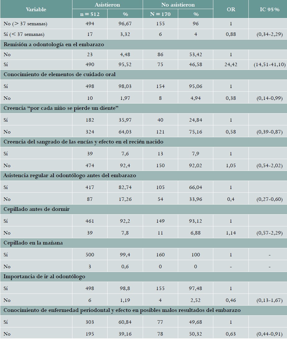 Results: Prevalence of attendance to the dental care clinic was 75.9 %. The variable with the highest positive association with attendance to the dental clinic was referral to the dentist (OR = 25,90; 95 % CI: 14.60-45.96). The variable with the highest negative association was lack of knowledge of the impact of periodontal disease on perinatal outcomes (OR= 0.61; 95 % CI: 0.38-0.97) and failure to visit the dentist regularly before pregnancy (OR= 0.49; 95 % CI: 0.29-0.82).