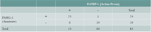 Resultados: De 83 pacientes, 27,7 % dieron positivas para ruptura prematura de membranas (RPM) con la prueba PAMG-1 (Amnisure) y 28,9 % con la IGFBP-1 (Actim-Prom); el único caso dispar resultó positivo a la amnionfusión con índigo de carmín. La concordancia entre ambas pruebas fue de 0,97.