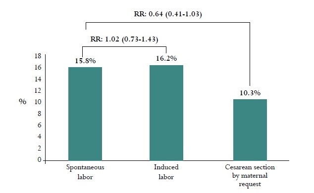 Abstract: Objective: There is insufficient evidence about the impact of cesarean delivery on maternal request (CDMR). This study was designed to evaluate different maternal and neonatal outcomes comparing CDMR with vaginal deliveries in low-risk pregnancies. Materials and methods: Prospective observational study including women aged 18 to 45 with a low-risk, term pregnancy, who delivered between June 2008 and April 2012 at a University Hospital in Bogota Colombia. The occurrence of any of 5 pre-specified adverse maternal events (maternal outcome) and of any of 17 pre-specified adverse neonatal events (neonatal outcome) was compared between CDMR and vaginal deliveries. Induced vaginal deliveries were analyzed separately. All women received the same standard of care. The effect of confounders was adjusted using multivariate logistic regression. Results: The study included 214 women with CDMR, 341 with spontaneous vaginal delivery (SVD) and 376 with induced vaginal delivery (IVD). Relative to the SVD group, the multivariate-adjusted odds ratios for adverse maternal outcomes were 0.21 (95% CI: 0.05-0.97) in the CDMR group and 0.93 (95% CI: 0.42-2.06) in the IVD group. The multivariate ORs for adverse neonatal outcomes were 0.59 (95% CI: 0.36-0.93) for CDMR and 0.84 (95% CI: 0.59-1.21) for IVD. The frequency of hospitalization of the newborn was lowest in the cesarean delivery group (10.3% versus 15.8% for spontaneous deliveries, 16.2% for induced vaginal deliveries). Conclusions: Among low-risk pregnancy women who entered a standardized obstetric care protocol, CDMR was associated with a lower rate of adverse perinatal outcomes when compared to spontaneous vaginal delivery. Further studies are needed to assess long-term the safety of CDMR.