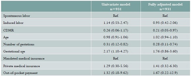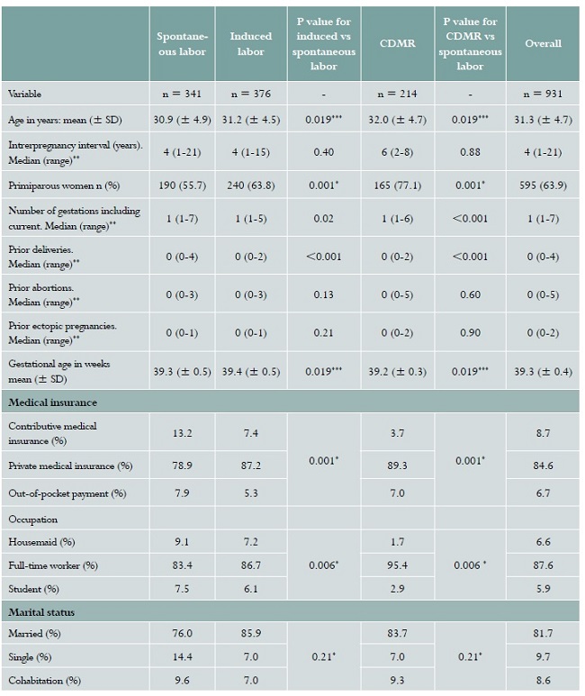During the study follow-up, 214 women had cesarean delivery upon maternal request, and 717 went into labor: 341 labors started spontaneously and 376 were induced. The number of patients enrolled by year was: 95 patients in 2008, 62 patients in 2009, 287 patients in 2010, 301 patients in 2011, and 186 patients in 2012. Among the 341 women who began labor spontaneously, there were 57 cesarean sections (16.7% rate of unplanned cesarean delivery), while among the 376 women who had an induced labor, there were 148 cesarean sections (39.4% rate of unplanned cesarean delivery). Thus, the total study population comprised 931 women and their newborns (Table 1). The average age of study participants was 31.3 ± 4.7 years, being slightly but significantly higher in the CDMR group compared to the spontaneous labor group. The overall median length of the inter-gestational period among non-primiparous women was 4 years, without significant differences across groups. There was a larger proportion of primiparous women in the CDMR group (Table 1). These differences are of little clinical significance due to their small magnitude. Mean gestational age at delivery was similar between the spontaneous and induced labor groups and significantly shorter in the CDMR group, albeit by a very small magnitude (0.1 weeks shorter). Relative to women in the spontaneous and induced labor cohorts, a larger proportion of women in the CDMR cohort had private medical insurance or reported their work status as "full-time worker".