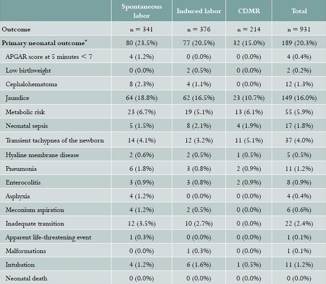 The study exposure was the mode of delivery intended by the mother. Within the vaginal delivery group, and given the potentially different impact on mother and child, induced deliveries were analyzed separately. Thus, the three cohorts being compared were 1) CDMR (women with >=39 weeks of pregnancy); 2) spontaneous vaginal delivery (per study protocol, women with >= 37 weeks of pregnancy were eligible, analyses were restricted to women with >= 39 weeks of pregnancy); 3) induced vaginal delivery (women with >= 39 weeks of pregnancy). The primary maternal endpoint was the occurrence of at least one of the following conditions in the mother: need for blood transfusion during the delivery or during the postpartum period, hysterectomy, admission to the intensive care unit (ICU), obstetric trauma and puerperal infection (surgical site infection, myometritis or endometritis). Secondary maternal endpoints were: development of a perineal tear during delivery (grade 1, 2, 3 or 4), length of mother's hospitalization, and maternal mortality. The primary neonatal endpoint was the occurrence of at least one of the following conditions in the neonate: 5 minutes APGAR score below 7, low birth weight, cephalohematoma, jaundice, hypoglycemia, hypokalemia, neonatal sepsis, transient tachypnea of the newborn, hyaline membrane disease, pneumonia, enterocolitis, asphyxia, meconium aspiration, apparent life-threatening event (ALTE - characterized by a combination of apnea, cyanosis and abnormal muscle tone), malformations, intubation or neonatal death. Secondary neonatal endpoints were low birth weight and need for hospitalization of the neonate. All study participants were followed for 15 days after delivery for the evaluation of maternal or neonatal outcomes.