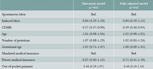 The frequency of hospitalization of the baby was lowest in the CDMR group (10.3% versus 15.8% for spontaneous, 16.2% for induced), this association was close to statistical significance (OR for hospitalization of the baby in the CDMR group with spontaneous labor as reference group: 0.64 [95% CI: 0.41 - 1.03]) (Figure 1). The average weight of the baby did not differ significantly among the three groups: 3161 (± 311 g) in spontaneous labor; 3153 (± 298 g) in induced labor; 3117 (± 300 g) in CDMR; p=0.9 for induced vs spontaneous, p=0.17 for CDMR versus spontaneous. APGAR score at 5 minutes was similar in the three study groups (Median 9.0, interquartile range 9-10 for the three groups).