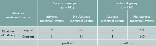 In a descriptive analysis, we explored the frequency of adverse maternal and neonatal events simultaneously among patients who intended to have a vaginal delivery, stratifying by study group (spontaneous, induced) and final form of delivery (vaginal or cesarean); these results are presented in Table 6. The frequency of adverse maternal events in either group was not associated with the final form of delivery (p from Chi-square test=0.70 for spontaneous, p=0.39 for induced).