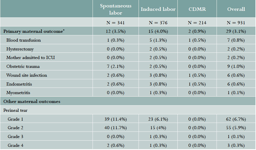 Maternal outcomes. The primary maternal outcome occurred in 29 participants (3.1% of the total study sample). The absolute frequency of the primary maternal outcome was lower in the CDMR group (0.9%) than in the vaginal delivery groups (3.5% in the spontaneous, 4.0% in the induced) (Table 2). The relative risk of the primary maternal outcome in the CDMR group relative to the spontaneous labor group was 0.26 (95% CI: 0.06-1.17). After adjusting for multiple confounders including the final way of delivery (vaginal or cesarean) in logistical models, the negative association of CDMR with the primary maternal outcome persisted and became significant (OR 0.21 [95% CI: 0.05- 0.97]) (Table 3). The risk of the primary maternal outcome was not significantly different between the spontaneous and induced labor groups (Table 3).
