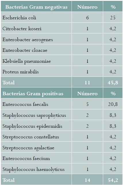 Se encontró BA en 24 gestantes, para una prevalencia del 10,6 %. El uropatógeno más frecuentemente aislado fue la E. coli en un 25 % de los casos, seguida por Enterococcus faecalis en un 20,8 %. En menor proporción se aislaron otras enterobacterias como: C. koseri, E. cloacae, E. aerogenes, K. pneumoniae y P. mirabilis. Con relación a las bacterias Gram positivas, se aislaron en menor frecuencia S. saprophyticus, S. epidermidis, S. constellatus, S. agalactiae, E. faecium y S. haemolyticus (tabla 1).
