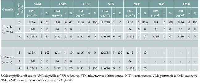 E. coli y E. faecalis fueron los gérmenes más comúnmente aislados en el grupo de estudio, expresando una resistencia a la ampicilina de 33,3 y 20 % respectivamente; el resto de enterobacterias identificadas presenta una resistencia natural a dicho antibiótico, lo que limita el tratamiento empírico y condiciona a un alto riesgo de falla terapéutica, sugiriendo la realización de urocultivo y antibiograma.