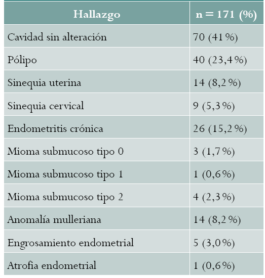 Resultados: De un total de 195 pacientes que cumplieron los criterios de selección se incluyeron 171. Se excluyeron 24 pacientes que no terminaron su tratamiento en esta Unidad. Las pacientes incluidas tenían una mediana de edad de 40 años (RIQ 36-43 años); de ellas, el 86 % nulíparas, y 42 % con diagnóstico de infertilidad primaria, 39 % secundaria y 20 % terciaria. En el 59 % de los casos se encontraron alteraciones endometriales. En el 7,6 % se encontró más de un hallazgo patológico. Hubo una frecuencia de complicaciones de 3 % (dolor y efecto vasovagal), sin complicaciones mayores, y una frecuencia de cancelación de 8 %.
