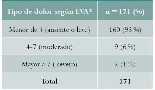 Adicionalmente, hubo 13 cancelaciones (8 %); de estas, 80 % (n:11) por necesidad de procedimiento en quirófano o por intolerancia al dolor (1,2 % (n:2). La distribución del nivel de dolor se presenta en la tabla 2.