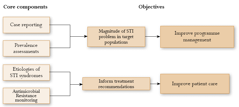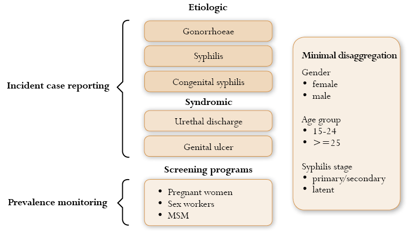 Identifying specific populations who are at greatest risk of STIs (d) periodic collection of prevalence data for gonorrhea, chlamydia and syphilis through representative sample surveys (both in known key risk populations, as well as in general low-risk populations), (e) capture of routine screening data (e.g. syphilis screening in ANC and in blood donors) and (f) STI case reporting with monitoring of overall trends, key populations with greatest risk of STIs, and program impact. WHO has developed simplified guidance on the core components of STI surveillance and core indicators for monitoring of STI prevalence (figures 1 and 2)6.