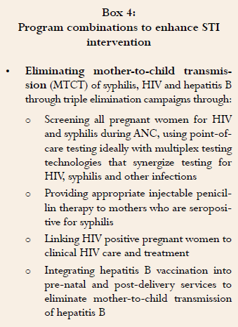 The impact of these interventions and of an STI programme as a whole can be enhanced by combining STI interventions with other relevant initiatives and programmes such as HIV education, mother and child health, cancer, immunization or sexual and reproductive health. The packaging of interventions for maximum impact can include ANC screening and treatment of syphilis and HIV, delivery of HPV and hepatitis B vaccines, and controlling the spread of gonococcal antimicrobial resistance (AMR) (Box 4). Strong linkages can significantly improve coverage of interventions and quality of care. The cost of STI interventions can also be reduced when these are delivered in combination with other services.