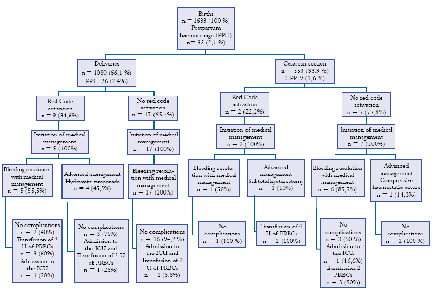 Results: Out of 1633 births (1080 vaginal deliveries and 553 cesarean deliveries), 35 cases (2.1%) (26 and 9, respectively) were identified and the "obstetric red code" was activated in 11 cases (0.67%). There was no maternal mortality. The main cause of PPH was uterine hypotonia in 29/35 (82%), and 82.8% of the cases resolved with medical treatment. Uterine tamponade was required in 4/35 (11.4%) women to control bleeding, and surgical management was required in 2/35 (5.6%) women: haemostatic sutures in 1/35 (2.8%) and hysterectomy in 1/35 (2.8%).